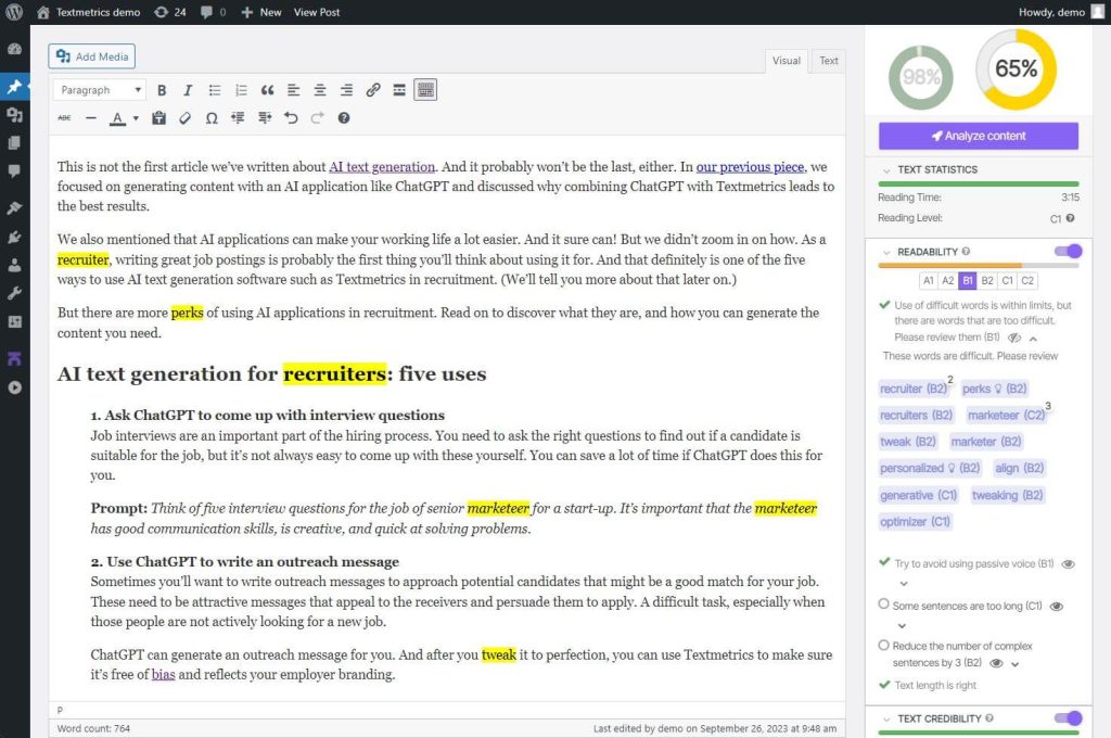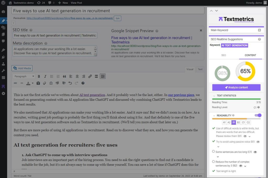 Verbeter direct de SEO en leesbaarheid van je website met de Textmetrics WordPress plugin, die realtime AI suggesties geeft om je te helpen hoogwaardige, inclusieve en conversiegerichte content te schrijven, rechtstreeks in je editor.